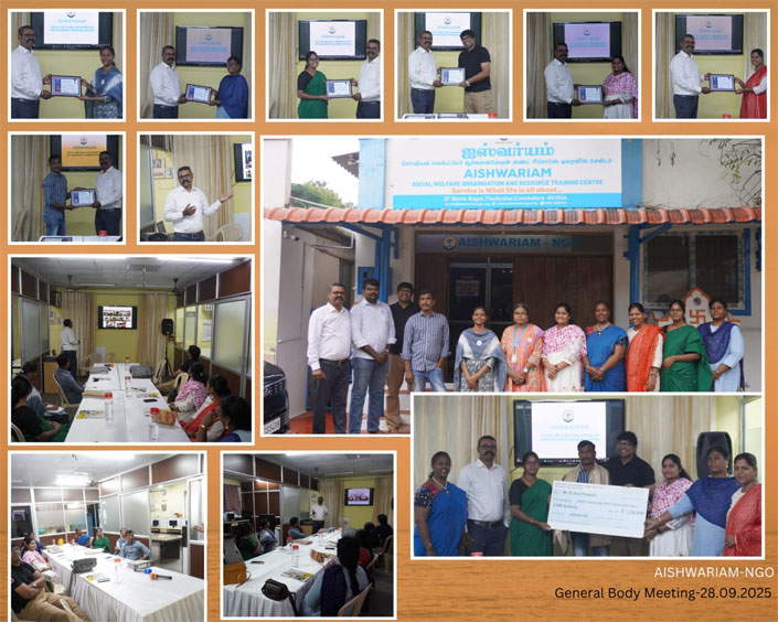 The General Board Meeting was held on 28.09.2025. The usual proceedings were followed by the elaborate presentation of the Annual Report and Activities of previous year, discussions on budget for the financial year, Programmes for the upcoming year and fundraising strategies for events and projects were some of the discussions. As a part of honouring the Board members, Award with commendation was given to each member, the Board members felt elated to receive such an award in recognition of their contribution towards ASWO.